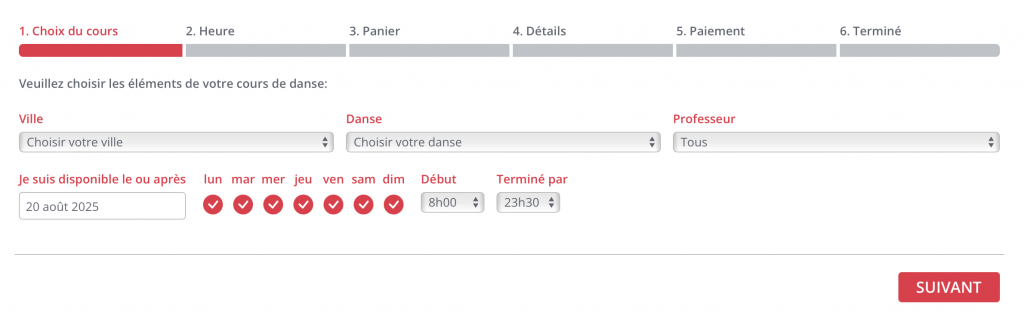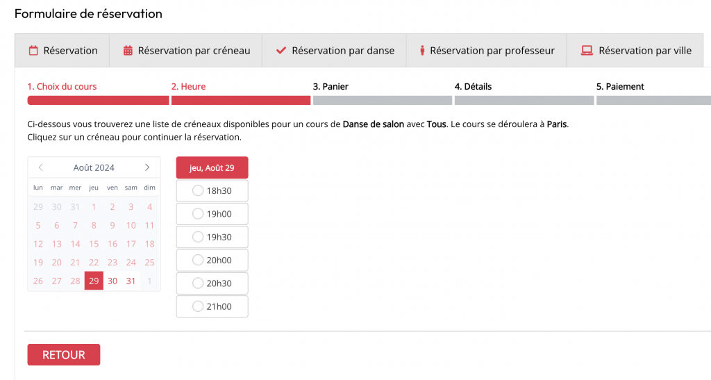 1. Visibilité accrue : Dance Booking vous offre une plateforme pour présenter vos compétences et votre expertise à un public plus large. Cela augmente vos chances d’être découvert par des couples à la recherche de cours de danse particuliers. Vous êtes associé à une ville ou une zone géographique. 2. Gestion simplifiée des réservations : En utilisant une plateforme en ligne, la gestion des réservations devient plus simple et plus efficace. Vous pouvez facilement suivre vos disponibilités, gérer les demandes de cours, et organiser votre emploi du temps sans tracas. 3. Accès à un public ciblé : Dance Booking est spécifiquement dédié aux cours particuliers de danse en couple. En vous inscrivant, vous atteignez directement des clients potentiels intéressés par ce type de service, ce qui peut augmenter votre taux de conversion de prospects en élèves. 4. Réduction des efforts de marketing : En tant que professeur inscrit sur Dance Booking, vous bénéficiez des efforts de marketing de la plateforme. Cela signifie que vous n’avez pas besoin de consacrer autant de temps et de ressources à la promotion de vos services, la plateforme s’en charge en grande partie. 5. Flexibilité et autonomie : Vous pouvez définir vos propres tarifs, choisir vos horaires de cours, et sélectionner les styles de danse que vous souhaitez enseigner. Cela vous permet de gérer votre carrière de manière flexible, tout en ayant le contrôle sur votre emploi du temps et votre modèle de tarification. |