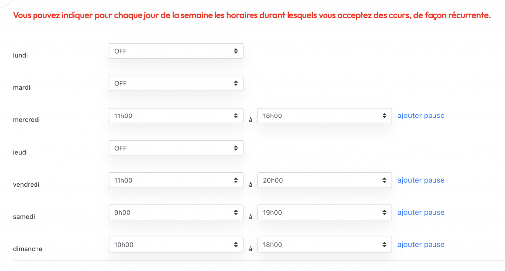 5. Conduite des Cours :Une fois la réservation confirmée, le professeur rencontre l’élève à l’heure et au lieu convenus. Le professeur dispense le cours selon les attentes et objectifs discutés.Paiement : Vous ne payez rien à la plateforme. Il n’y a pas de transfert d’argent entre la plateforme et vous. Les élèves vous paieront la totalité du montant que vous avez fixé pour le cours lors de votre rencontre. Les élèves paient en ligne uniquement les frais de réservation (équivalent à 25 % du prix du cours).